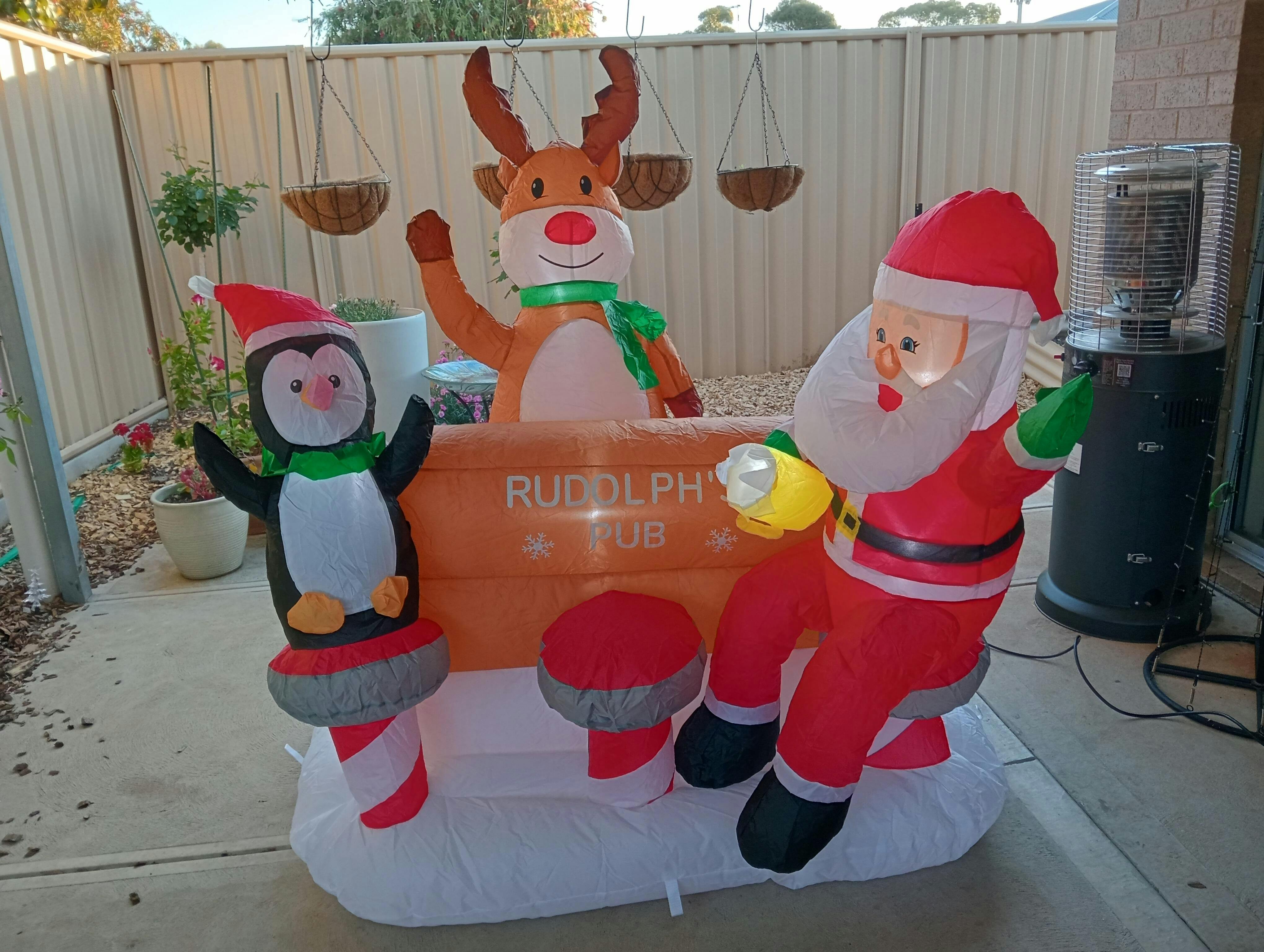 Enjoy some holiday cheer with this 150cm inflatable Rudolph's pub, featuring Santa and a Penguin, a whimsical addition to your outdoor decor.